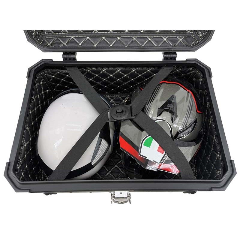 Das GPR TECH ALPI-TECH Topcase bietet mit einem großzügigen Volumen von 55 Litern ausreichend Stauraum für Ihren Motorradalltag. Gefertigt aus hochwertigem 5052 Aluminium mit verstärkten Ecken, besticht es durch außergewöhnliche Stabilität und eine elegante, schwarze Oberfläche. Das Topcase lässt sich dank der mitgelieferten spezifischen Platte und Hardware ohne Modifikationen direkt am Original-Gepäckträger montieren und erlaubt die sichere Aufbewahrung eines Enduro-Helms.